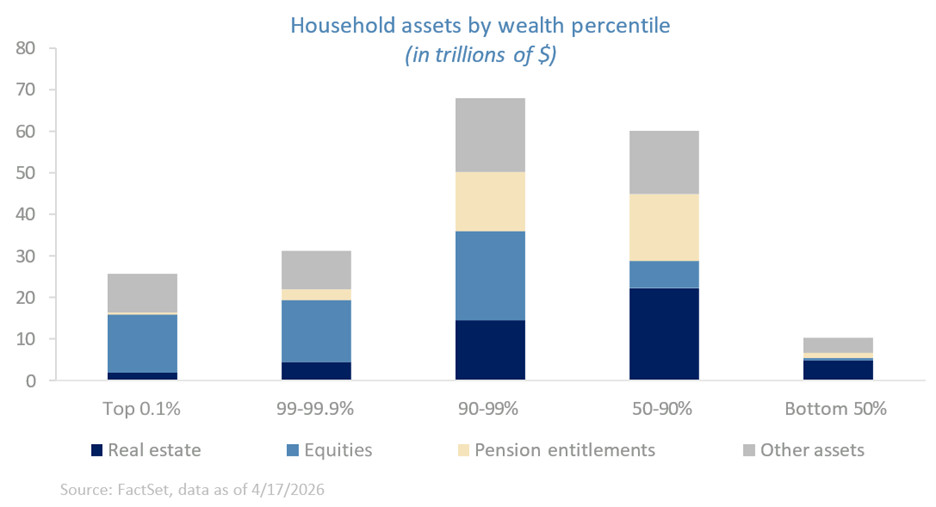 The growing divide between income groups is contributing to a more concentrated pattern of consumer spending, with a larger share driven by higher-income households. As a result, overall economic activity becomes increasingly dependent on a smaller segment of consumers, many of whom are more sensitive to changes in asset prices and financial market conditions. Currently, it is estimated that the top 10% of households generate nearly 50% of all spending, which translates to about one-third of US GDP. If this group pulls back spending due to equity market volatility or a significant market correction, the effects can ripple more broadly across the economy. This dynamic also has labor market implications, as lower-income households are often employed in sectors that depend on discretionary spending from higher-income consumers.